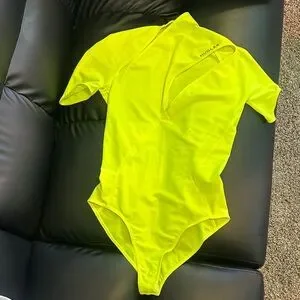 This Thierry Mugler bodysuit features a striking and modern design. The garment comes in a vibrant neon yellow shade and has an asymmetrical cut-out detail on the chest, creating a unique and bold look. The short-sleeve bodysuit is form-fitting, emphasizing the contours of the body, and includes a high neckline with an off-shoulder effect.