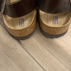 Elegant dark brown leather sandals with triple adjustable buckles. Ideal for everyday comfort.