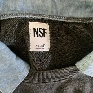 Stylish NSF gray sweatshirt with contrasting blue collar. Relaxed fit. Buttons on sleeves.