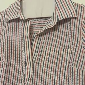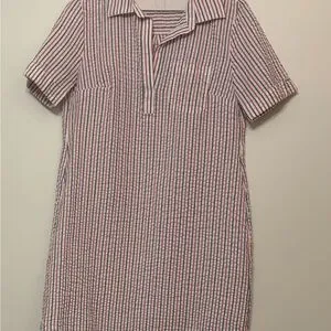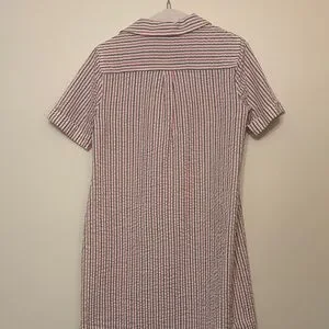 Lightweight seersucker striped dress with short sleeves. Features a classic collar and front pocket. Perfect for next year’s Memorial Day or Independence Day celebrations or any summer preppy/patriotic occasion.