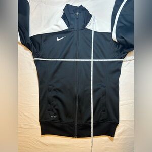 Nike Dri-Fit black and white set Features logo on both pieces. Front zip closure on jacket with zip pockets on jacket and pants as well as ankles. The jacket is a medium and pants are size small. Only worn a couple times no piling no tears like new condition.