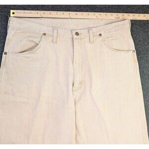 The Vintage Wrangler Jeans Men's 38x34 in Beige are a classic piece of American denim with a relaxed fit perfect for a casual cowboy look. Made in the USA with durable cotton denim, these jeans feature a solid color, zip closure, and a 5-pocket design. The timeless style and quality craftsmanship of Wrangler's Cowboy Cut make these jeans a wardrobe staple for any man looking for a rugged yet stylish addition to their wardrobe. A7 0291