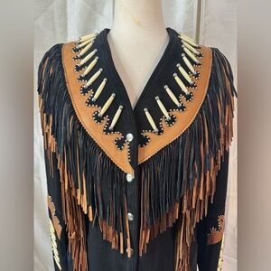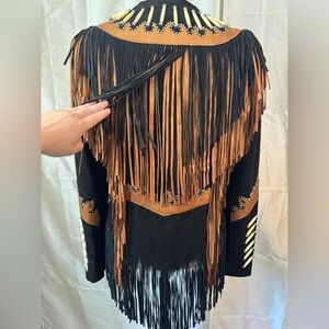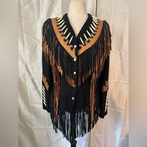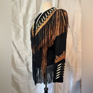 Stylish black and brown jacket with fringe details. Features silver accents for a bold look.
