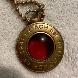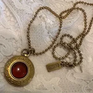 Coach Logo Pendant of Amber Glass in Gold Tone Surround on a Gold Tone Chain measuring approximately 27” (approximately 13.5” drop plus pendant). The pendant is about the size of a fifty-cent piece coin. Amber glass center is surrounded on both sides by gold tone “Coach est. 1941” repeated. Coach gold tone tag attached to clasp.