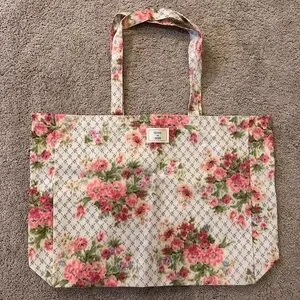 This stylish floral tote bag features vibrant pink and green accents on a blue and white background. Made with thick canvas, ideal for everyday use!