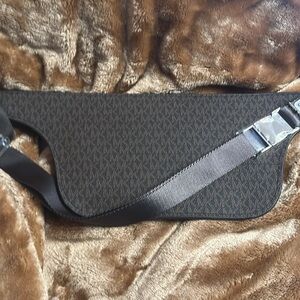 Elegant Michael Kors belt bag in dark brown. Features gold zippers and logo detail. Ideal for hands-free style.