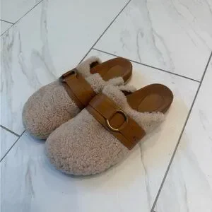 Chloe Shearling Clogs with Tan Strap