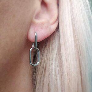 About this item Material: These silver paperclip hoop earrings are made of brass with 14k silver plated that is not cause damage to your ears, which is comfortable for sensitive ears. High polished finish makes it shiny, no fade and rust Size: Upper rectangle: 0.75 *0.47 inch,small rectangle: 0.7 *0.4 inch. Chunky hoop earrings are lightweight, comfortable to wear Design: Unique rectangle U shaped and with flexible clasp, very easy to put on and take off. An ideal purchase of the huggie hoop earrings. Perfect addition for daily looking Nice Gift: Those delicate huggie earrings for women are perfect for all looks and any occasion, for example