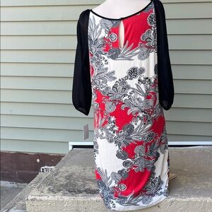 Step out in style with this chic sheer three-quarter sleeve dress, featuring a bold red and black pattern. Perfect for any occasion, this dress combines elegance with comfort. This dress is so soft and has a lining. Love the color combination and the pattern. The sleeves are sheer with elastic at the bottom. This has a keyhole one button on the back. Approximate measurements are 20 inches pit to pit and 32 inches from shoulder to bottom of dress. As always smoke and pet free home. Same day shipping! Willing to negotiate prices. Purchase this from a boutique.