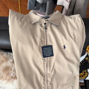 Stylish tan windbreaker by Polo Ralph Lauren. Features a sleek zip-up design. Lightweight and wrinkle resistant.