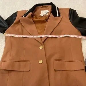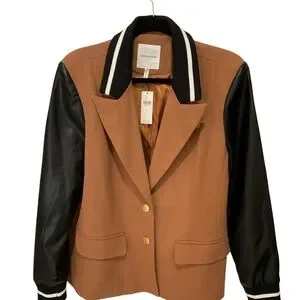 Stylish blazer with tan body and black sleeves. Features gold buttons and a modern design.