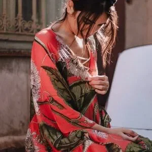 Scarlet red (with a slight hint of orange) lightweight kimono/throw-over with green and white floral patterns.
