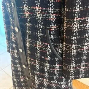 This SOLD OUT new with tags Maje Paris Renafay dress blends Parisian chic with timeless tailoring. Crafted in bouclé plaid tweed with faux-leather trims and a point collar, it features silver logo buttons, an A-line silhouette, and three-quarter sleeves. A polished mini dress that transitions effortlessly from day to night, paired with knee-high boots or heels. Original retail $495.
