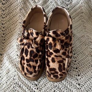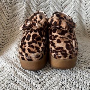 Chic animal print platforms with elegant bow detail. Adds flair to any ensemble.