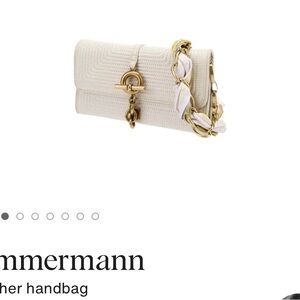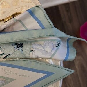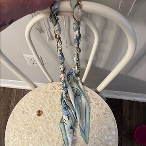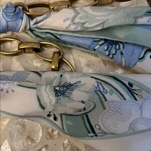 Chic Zimmermann scarf with floral design. Features soft blue and cream hues. Gold chain adds elegance. Pairs well with the quilted leather mini evening bag (not included) or the scarf can be removed and worn separately.
