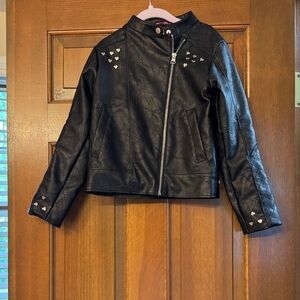 Chic black synthetic leather jacket with iconic red and white design. Perfect for playful style.