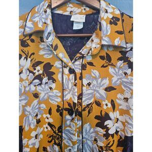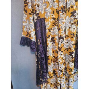 Zadie B's Duster, size med, button up front, 3/4 sleeve with lace cuffs, lace inserts on sides, longer in back than front, purple lace, gold, white grey and purple material.