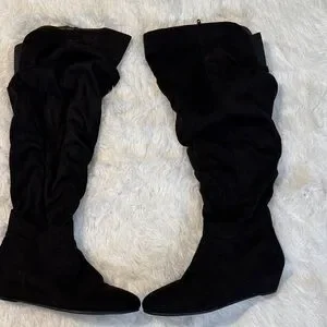 Step out in style with these elegant black faux suede wedge (2 inch) boots Perfect for adding a touch of sophistication to any outfit. WORN ONCE!