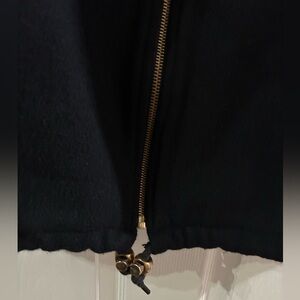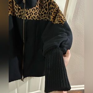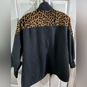 Russell Scott brand. Women’s size 16. Black and leopard print. Wool blend coat. Has pockets, collar, and small padded shoulders. It does have beads at the bottom to tighten it.