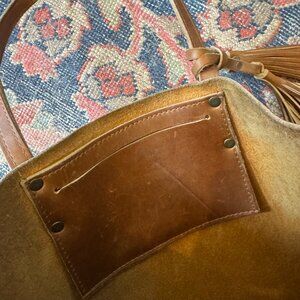 Handmade leather bucket tote by Arc Of A Diver. Well broken in, but still has years of life left in her.