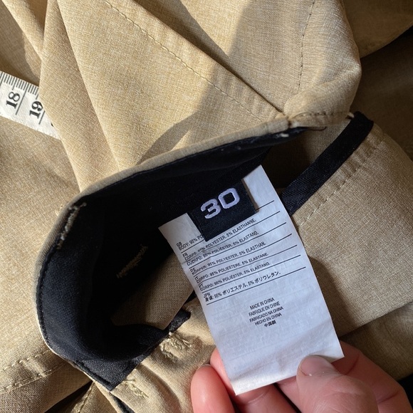 Sand colored stretch chinos perfect for vacation, golf or casual wear. Very gently worn by my husband for one golf weekend. He’s been at the gym a lot and his body has changed so these no longer fit him. Would love to connect them with another guy. Laundered and ready. Lay flat measurements: Waist 16” Length 20.5” Hips (at pockets) 20” Condition: hardly worn, worn for one golf tournament, subtle charcoal gray mark pointed at in pictures. Feel free to message if you have any other, happy to help.