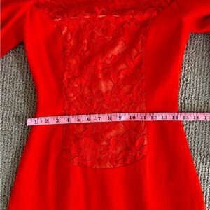 Exquisite soft red dress with lace detailing. Long sleeves for a classic look. Ideal for elegant occasions. Great condition. Zips in back.