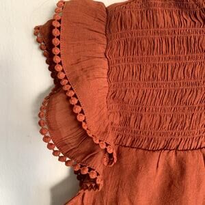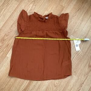 2-Piece Smocked Pants and Top Set. Pullover, smocked, round mockneck with ruffle detail, short sleeve flared flutter ruffle detail with embroidered detail, back keyhole closure. Pull on, flat front, wide leg elastic smocked waistband, 2 side slit pockets, cropped length, 1/3 lined.