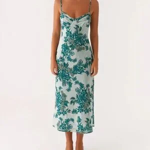 Elegant teal floral midi dress with spaghetti straps. Perfect for a wedding guest dress.