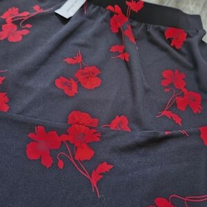The NWT Lane Bryant Asymmetrical Skirt in black with red floral print is a versatile piece perfect for various occasions including travel, parties, casual wear, and workwear. This pull-on midi skirt features a flattering flare style with an elastic waist for added comfort and stretch. Made from a lightweight knit fabric blend of polyester and spandex, this skirt is machine washable and suitable for wearing in the summer, fall, and spring seasons. The asymmetrical design adds a unique touch to this stylish and practical piece, making it a great addition to any woman's wardrobe.
