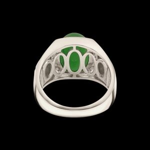 Breathtaking 7.18 carat green jade cabuchon and .32 carats white zircon Guardian Dragon ring, set in rhodium over sterling silver. This ring is perfect for those who embrace their unique style.