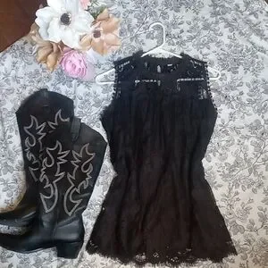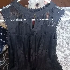 Elegant black lace top. shorter ladies the length being as long as it is you could wear as dress and noone would know and wow it would make a Beautiful sexy dress for sure to have some ppl hating, because its that stunning!!! the back has a keyhole closure with to small buttons. this blouse will definitely add a touch a elegance to your closet.. Sleeveless design and under linner for no worry wear it's never been worn