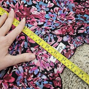 Bold floral pattern with striking pink and blue tones on black background. Elegant long sleeves. Ideal for stylish outings. waist stretches to at least 22" while flat. Very fun but easy to wear