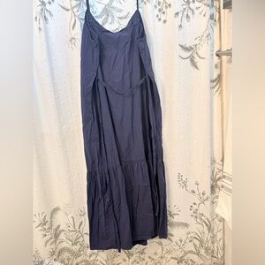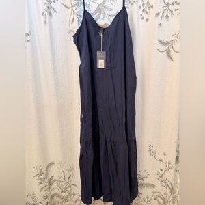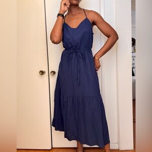 Elegant deep blue maxi dress with adjustable tie waist. Ideal for any occasion.