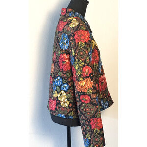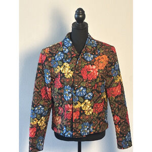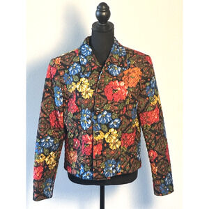 Elevate your wardrobe with the Maggie London Quilted Crop Jacket, a versatile and stylish addition that promises to be a standout piece. Crafted from 100% silk, this jacket boasts a luxurious feel and a vibrant floral pattern that effortlessly captures the essence of a London-inspired theme. The short jacket/coat length paired with a collared design and lightweight fabric makes it an ideal choice for various occasions, from casual outings to business meetings or even cocktail parties. Size 10 ensures a regular fit for those who appreciate both comfort and elegance. The quilted style of this jacket adds a touch of sophistication, while the multicolor palette allows for easy pairing with a multitude of outfits. Whether you're looking to make a statement at an evening event or seeking a sophisticated layer for day-to-day wear, this Maggy London jacket is an exquisite selection for the fashion-conscious woman. Please view all pics carefully and let me know if you have any questions. All items come from a smoke and pet free home.