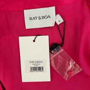 The Rat & Boa Paloma Dress is a vibrant and stylish wrap dress that demands attention. Cut from a shimmering pink fabric with a subtle floral pattern, this mini dress features a deep V-neckline, a collar, long sleeves with flared cuffs. Its daring length and wrap-over design create a stunning silhouette, perfect for special occasions and confident women who want to make a statement.