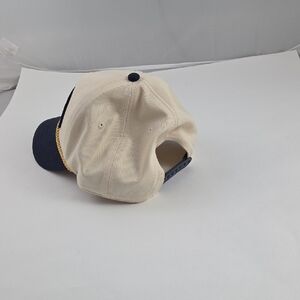 Stylish cream and navy hat. Features Willie Nelson patch. Gold rope detail on brim.