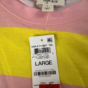 Vibrant pink and yellow stripes. Cozy and stylish. Ideal for casual wear. Women’s size L NWT. Style & Co Brand. Long sleeve tshirt. Not heavy.