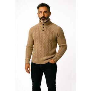 - Original Weatherproof size (M) light beige or cream in color textured cable knit design with a high collar with button detail