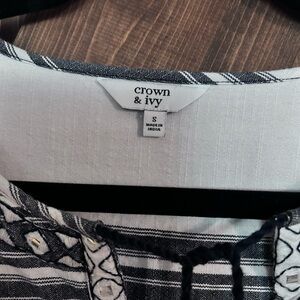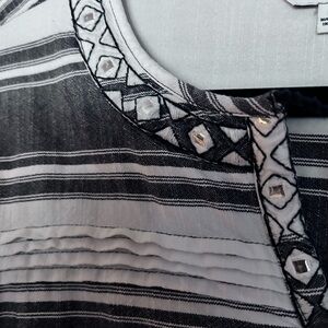 Chic blouse with black and white stripes. Features intricate neckline and sleeve designs. Ideal for casual wear.