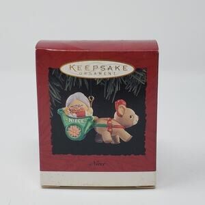 1994 Hallmark Niece Ornament. This Christmas tree ornament features a reindeer pulling a carriage that’s holding an aunt with her baby niece.