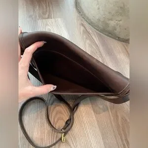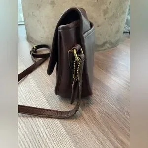 Classic vintage Coach bag in deep brown. Due to age, expect slight tarnishing on hardwear, scuffing on leather edges, light scratches (can be buffed). Overall in very good condition. No peeling, deep scratches, or separation of leather. Great for everyday and travel. Adjustable, no -removable strap.