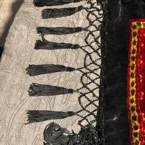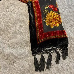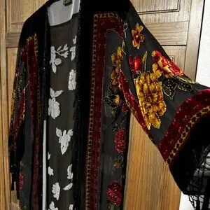 Burnout velvet with a sequined embellished flower pattern. Black with red and gold flowers. ¾” slightly belled sleeve. 40” long with 4 1/2 “ fringe. Like new condition. Smoke free home. Travel, sexy, party, vacation, date night, formal, semi-formal, boho, chic, classy.