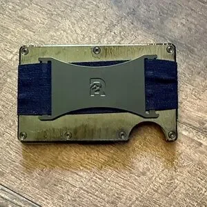 This rugged metal wallet features a sleek black strap for secure card holding. Perfect for the modern man, it combines style and functionality.