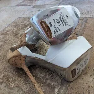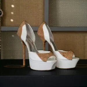 THESE ARE TRIED ON IN STORE BUT NOT WORN OUTSIDE. White faux leather with cork elements.