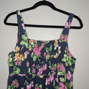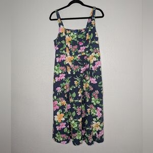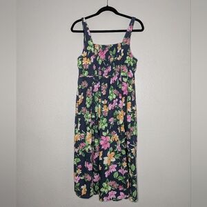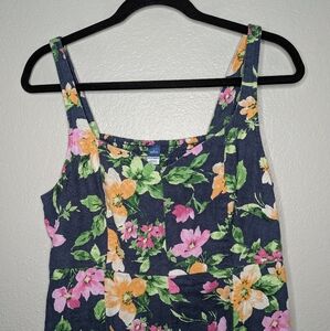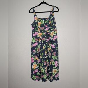 Sleeveless calf length dress with sweetheart neckline. Pink, orange, and green flower print, woven fabric, side pockets, smocked back, empire waist. 55% linen, 45% rayon. Gently used, women's size large petite.