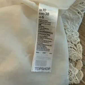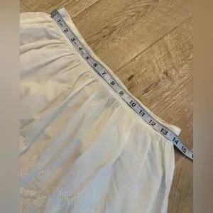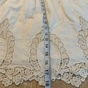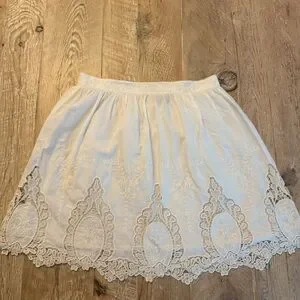 This Super feminine chunky cream lace mini skirt gives Doen vibes. Fully lined, exposed zipper back. Delicate embroidery on the waistband and throughout the skirt. Size 6