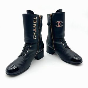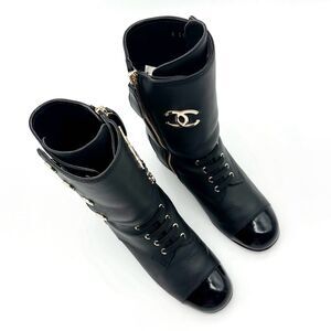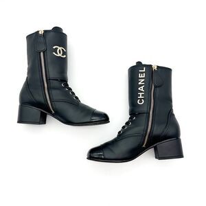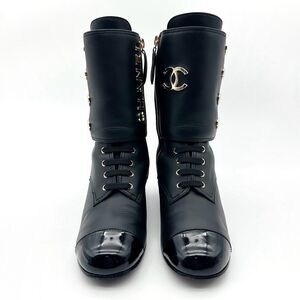 Crafted from buttery-soft black leather with glossy patent cap toes, these boots feature bold gold-tone CHANEL lettering and CC logo accents, along with oversized snap buttons for a striking finish. Designed with lace-up, side zipper, and snap-button closures for a secure and versatile fit. Set on a sturdy block heel for comfort and style. Perfectly balancing edgy sophistication and timeless luxury, these boots transition seamlessly from casual chic to elevated day-to-night looks.