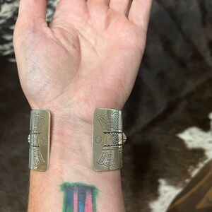 Elegant silver bracelet with detailed engravings. Perfect for any occasion. Has slight damage on either side of the top, see the last two pictures.