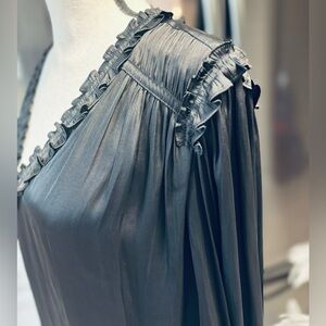 This elegant blouse from The Kooples features a black hue with a ruffled neckline and relaxed fit, perfect for versatile styling. The lightweight fabric and billowy sleeves add a touch of sophistication, making it suitable for both formal and casual occasions.