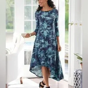 Elegant blue floral midi dress. Features 3/4 length sleeves and a high-low hem. Perfect for any occasion. From smoke-free home.